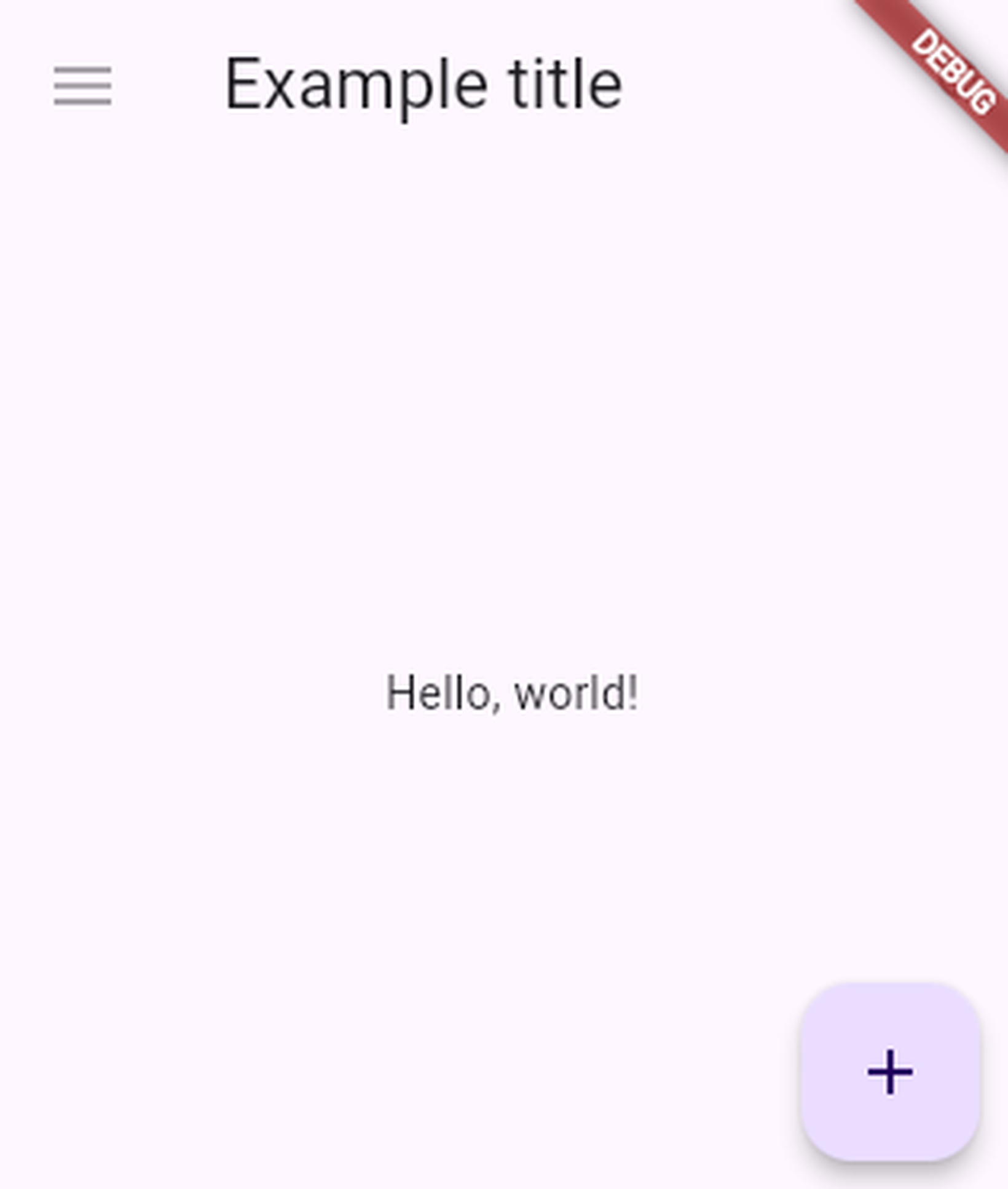 Widget build(BuildContext context) { // Scaffold is a layout for // the major Material Components. return Scaffold( appBar: AppBar( leading: const IconButton( icon: Icon(Icons.menu), tooltip: 'Navigation menu', onPressed: null, ), title: const Text('Example title'), actions: const [ IconButton( icon: Icon(Icons.search), tooltip: 'Search', onPressed: null, ), ], ), // body is the majority of the screen. body: const Center( child: Text('Hello, world!'), ), floatingActionButton: const FloatingActionButton( tooltip: 'Add', // used by assistive technologies onPressed: null, child: Icon(Icons.add), ), ); }