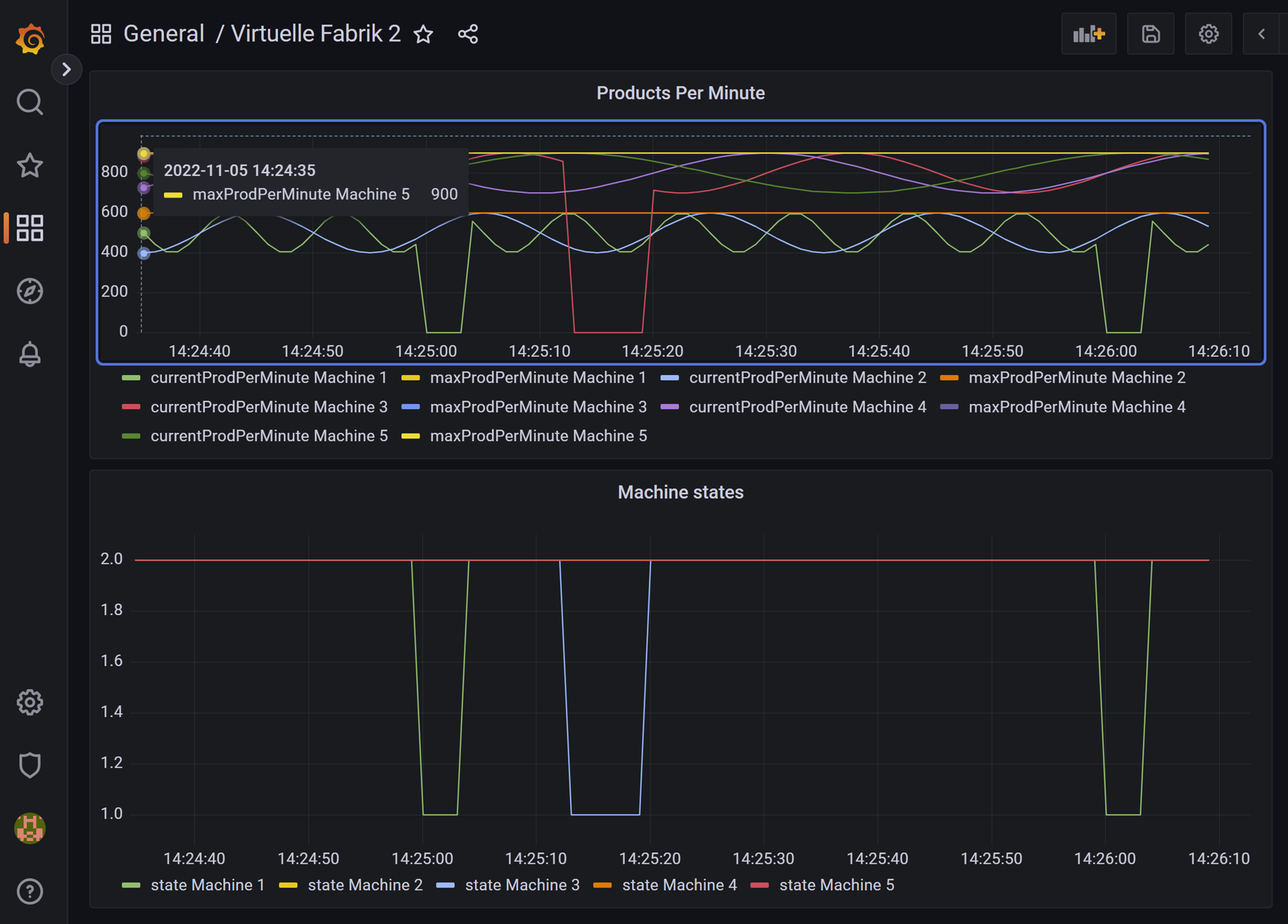 Die virtuelle Fabrik stellt realitätsnah generierte Maschinendaten zur Verfügung. Die enthaltenen Maschinenzustände, Schicht- und Chargendaten sowie Wochen- und Jahresplanung ermöglichen die frühzeitige Erkennung von Fehlern.