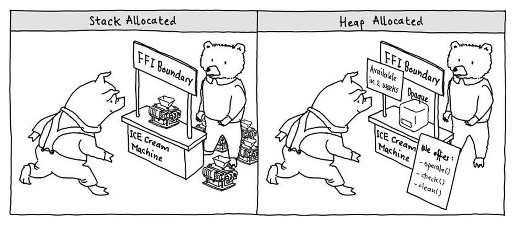 Ein zentrales Konzept zum Verständnis der Interoperabilitätsgrenzen sind opake Datentypen. Zur Veranschaulichung kann man sich eine Analogie zu einem Verkaufsstand für Eismaschinen vorstellen (siehe Abbildung unten). Der Verkäufer und der Kunde repräsentieren die beiden Programmiersprachen, während der Verkaufsstand der FFI-Schnittstelle entspricht. Der Verkäufer übergibt dem Kunden das Produkt ausschliesslich über diesen Stand - genauso wie eine Sprache ein Datenobjekt über die FFI-Schnittstelle an die andere übergibt. Die Produktübergabe (also der Datenaustausch) kann auf zwei Arten erfolgen: